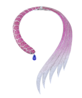 القلادة الرائعة مستوحاة من سمكة البيتا الرائعة والملائكية، حيث يعكس شكلها رقصة تخلقها الأسماك في الماء. مرصعة بالذهب عيار 18 قيراطًا مع أكثر من 4000 حجر- ياقوت متدرج إلى الياقوت الوردي والألماس وتكتمل القطعة المتلألئة بحجر تنزانيت لامع على شكل كمثرى يمثل المحيط الأزرق العميق: قطعة فنية فريدة من نوعها، تمّ تصميمها لجذب السحر بجمالها وتصميمها الفريد.