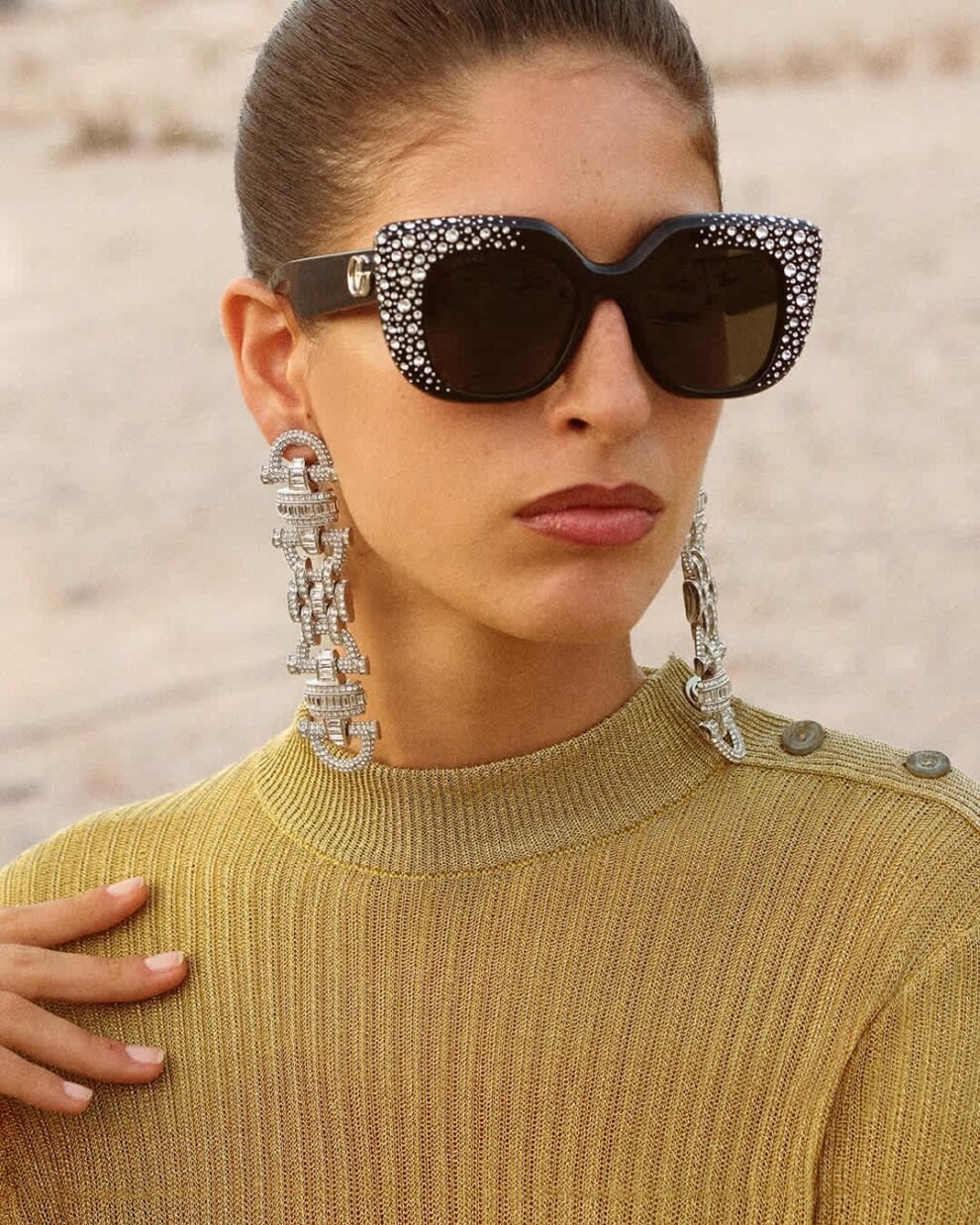 تخطف النظارات الشمسية الجديدة الأضواء في حملة غوتشي الجديدة الخاصة بشهر رمضان والعيد. تتزين الأطر الكبيرة الحجم على شكل فراشة، والتي تجمع بين الجرأة والأناقة، بتفاصيل زينية من حبات الستراس الكريستالي لإضفاء جاذبية لافتة على الإطلالة.