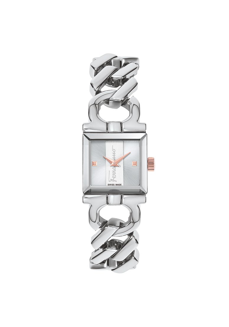 الساعة مرصّعة بالماس على مؤشرات الساعات وشعار Gancini المزدوج الشهير على عقرب الثواني، بينما السوار المصنوع من الفولاذ المقاوم للصدأ ومعالج بلمسة نهائية ثنائية اللون.