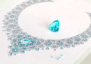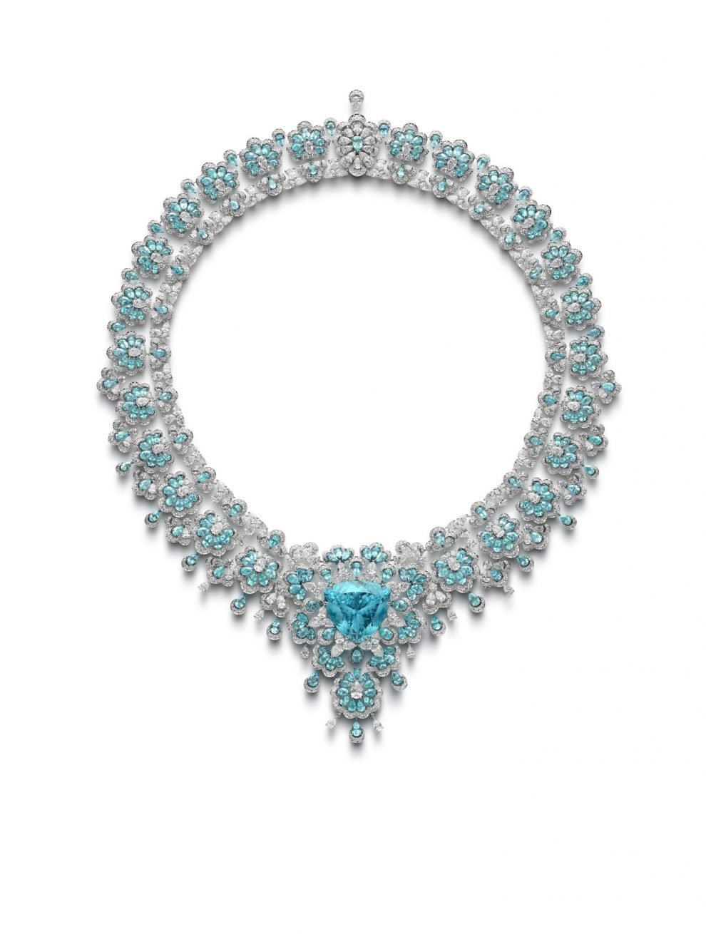 الموزمبيق، لا سيما أن هذا الحجر المميز يشتهر بلونه الأزرق الفيروزي النادر ويعد أحد أكثر أنواع التورمالين طلباً ورواجاً. وإلى جانب هذا الحجر النفيس تتناوب تنسيقات رائعة من أحجار الألماس بقطع كمثري ودائري، فتضفي بريقاً مبهراً على هيكل العقد الجديد المصنوع من الذهب والتيتانيوم.