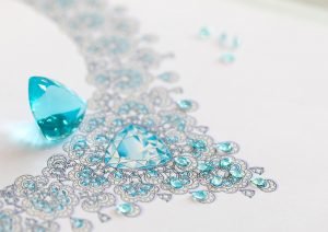 تقدم كارولين شوفوليه عقداً جديداً مرصّعاً بالألماس وتورمالين بارايبا الأزرق النادر أضافته مؤخراً إلى مجموعة (Precious Lace) المتألقة بإبداعاتها الساحرة. ينساب هذا العقد على جِيد المرأة التي ترتديه كشريط ناعم من الدانتيل فيضفي عليها ومضات من الجاذبية الفاتنة، في حين يتخلل زخارفه البرّاقة المفرّغة لمحات من خلجان بعيدة تتماوج على شطئانها المياه الزرقاء الصافية. ليجمع بذلك هذا العقد بين التصميم الفريد والأحجار الكريمة النادرة.