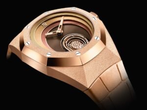تتميز ساعة رويال أوك كونسِبت فلاينغ توربيون “تمارا رالف” – Royal Oak Concept Flying Tourbillon “Tamara Ralph” ذات الإصدار المحدود بهيكلٍ مصنوع من الذهب الوردي عيار 18 قيراطًا وتزدهي بالذهب المطروق “فروستد جولد”. لقد أعادت مصممة المجوهرات كارولينا بوتشي قراءة تقنية المجوهرات الفلورانسية العريقة هذه، وقام حرفيو أوديمار بيغه بتعديلها في العام 2016 لتزيين ساعات المصنع. يتم إحداث فجوات صغيرة على سطح الذهب باستخدام أداة ذات رأس ماسي، مما يعطي تأثيرًا مُتوهجاً يُشابِهُ تألُّقَ الأحجار الكريمة. ويتعزز حضورها البصري الجذّاب من خلال الحافة المشطوفة المصقولة صقلاً لامعا التي تُشكّل الخط المُحدّد للشكل المثمن، في حين توفر جوانب الهيكل، المصقولة صقلاً ساتانياً، خطياً تباينًا إضافيًا. إن تجاوُر الأسطُح ذات تقنيات التشطيب المختلفة – وهي عملية دقيقة تتطلب محاذاة مثالية بين أسطُح الذهب المطروق وتلك المصقولة صقلاً لامعاً أو ساتانياً خطياً – يعطي إطلالةً فاخرةً للهيكل وبنفس الوقت يُضفي تلاعبًا ضوئياً لانهاية له.