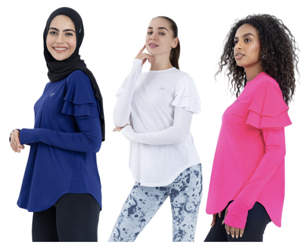 إليكِ آيه، قطعة الملابس العلوية المحتشمة متعددة الاستخدامات التي تضفي على إطلالتك مزيجًا من المرح والأنوثة. تمنح هذه القطعة الملونة بالكشكشة الأنيقة على الكتفين لمسةً من المرح والأناقة على مظهرك، وتلبي احتياجات الراغبات في ملابس محتشمةً تعكس أسلوبهن الفريد في الحياة.