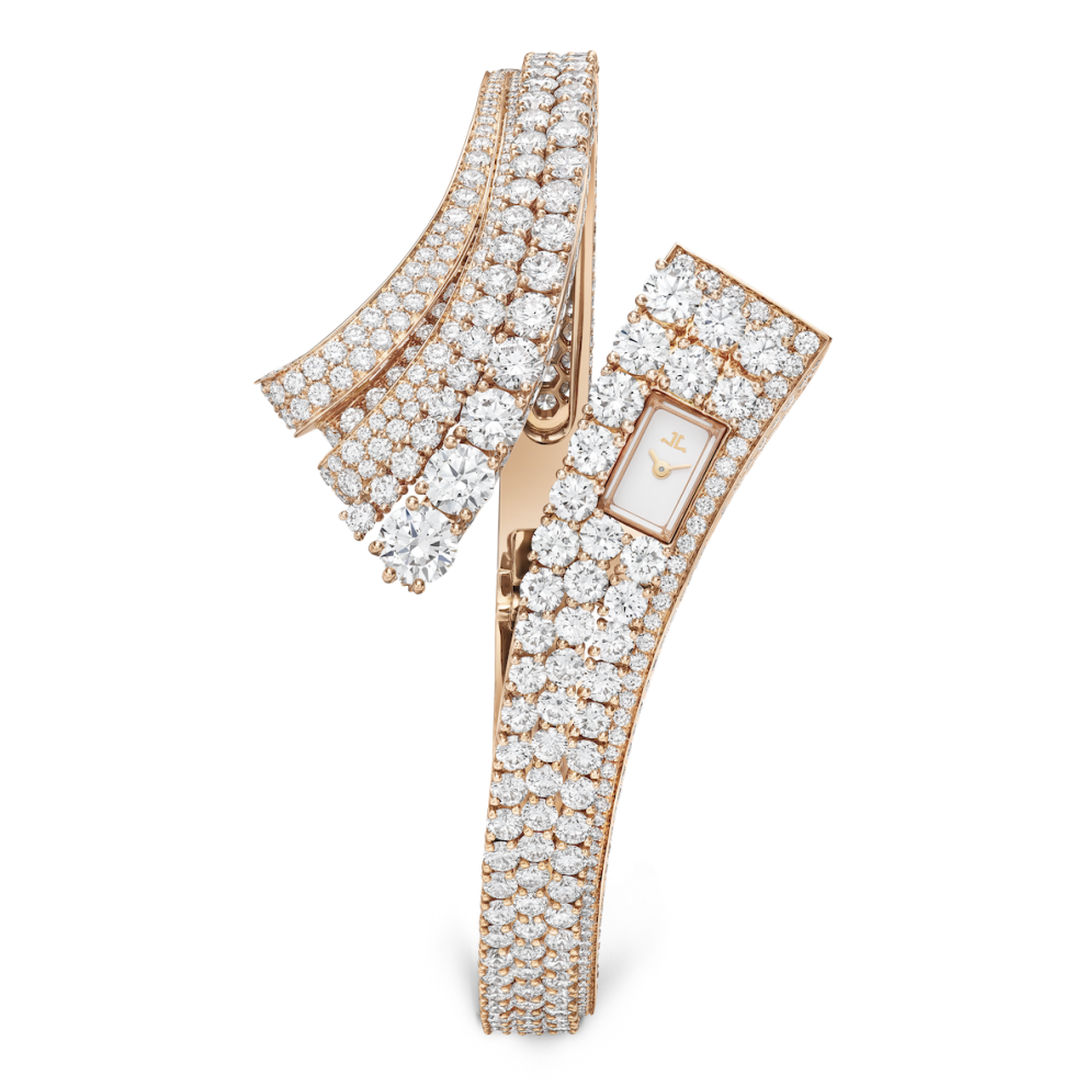 تستلهم ساعة سنودروب ذات السوار العريض تصميمها من الأزهار البيضاء التي تشبه شكل الجرس والتي تنمو عبر طبقة ثلجية رقيقة في فالي دو جو، وتنضح بأنوثة رقيقة. وتحيط دائرة من الماسات ذات شكل الكمثرى بالميناء لتشكّل زهرة، وتردّد أمواجٌ من الماس زخارف البتلات المتناسقة تناسقًا مثاليًا حول السوار بأكمله. وقد اختار مصمّمو جيجر- لوكولتر ترصيع الماس “المخلبيّ” الذي يحد من ظهور المعدن ويتيح مرور الضوء عبر الأحجار من كل الزوايا، فيزيد لمعان الساعة، ويعطي الانطباع وكأن الماسات تطفو فوق سطح السوار.