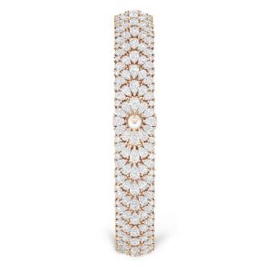 السوار: ذهب وردي مرصّع بـ 904 ماسة، من بينها ماسات بقطع بريانت و204 ماسات بشكل الكمثرى ويبلغ إجمالي وزنها 20.9 قيراط.