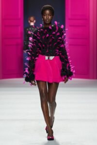 الريش ليس زينة حنينية، بل مادة حيّة: يستقر على قطع علوية مُهيكلة ويغمر المعاطف بخفّة مسرحية، صانعًا حركة تتباين مع صرامة الخياطة. هو لمسات من الهواء داخل البناء.