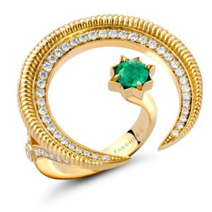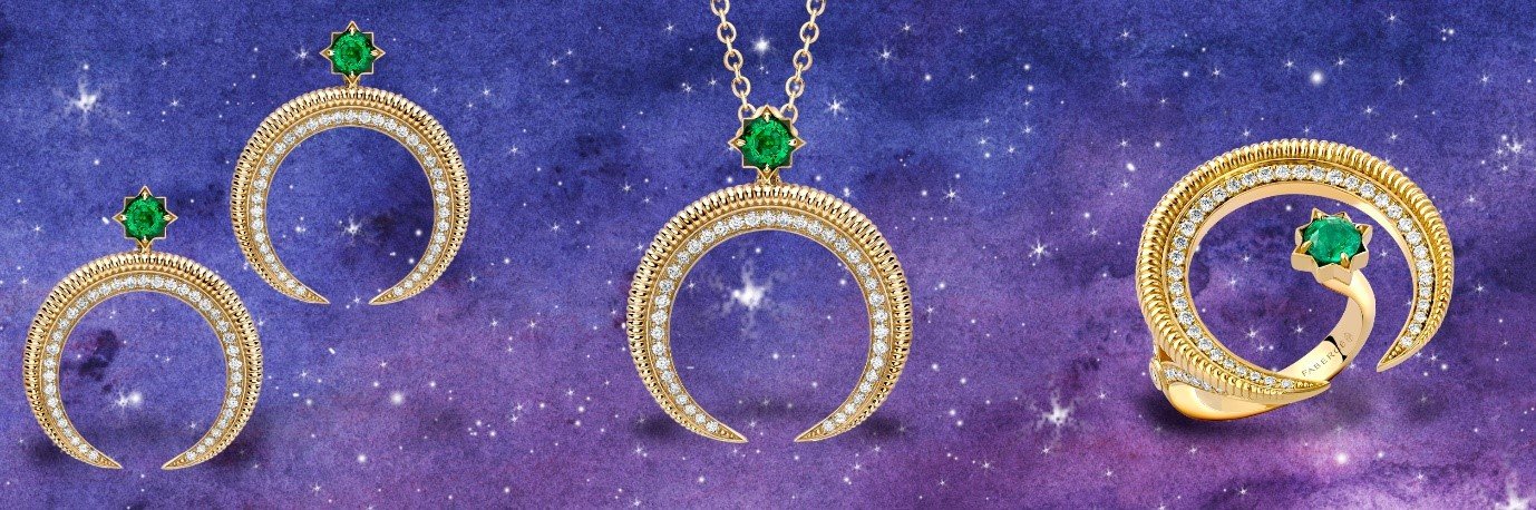 يُسرّ “فابرجيه” أن تطرح أحدث طقم من مجموعة الهلال، من وحي القمر والنجوم التي تُضيء سماءنا جميعاً. كل القطع مصمّمة يدوياً من الذهب الأصفر عيار 18 قيراط وفقاً لأسلوب التخديد التنميقي الذي تشتهر به الدار، وكل هلال مرصّع بحُبيبات الألماس البرّاقة، وتُحيط به نجمة جميلة مرصّعة بزمرّدة من شركة “جيم فيلدز”، وتحديداً من منجم كاجيم في زامبيا حيث يُستخرج الزمرّد بطريقة مسؤولة ومستدامة مع الحرص على الحفاظ على البيئة والمجتمع المحلي.