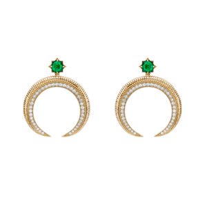 يُسرّ “فابرجيه” أن تطرح أحدث طقم من مجموعة الهلال، من وحي القمر والنجوم التي تُضيء سماءنا جميعاً. كل القطع مصمّمة يدوياً من الذهب الأصفر عيار 18 قيراط وفقاً لأسلوب التخديد التنميقي الذي تشتهر به الدار، وكل هلال مرصّع بحُبيبات الألماس البرّاقة، وتُحيط به نجمة جميلة مرصّعة بزمرّدة من شركة “جيم فيلدز”، وتحديداً من منجم كاجيم في زامبيا حيث يُستخرج الزمرّد بطريقة مسؤولة ومستدامة مع الحرص على الحفاظ على البيئة والمجتمع المحلي.