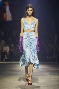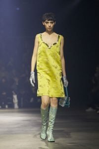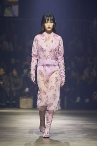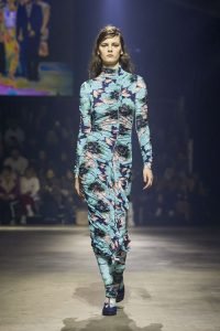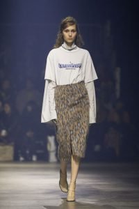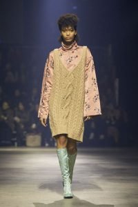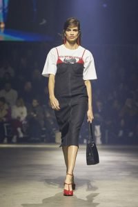 كذلك، تمّ تنسيق بناطيل الحمولة (cargo pants) من التويد، معاطف من الصوف السميك (pea coats) وفساتين من دون أكتاف وأكمام (bustier dresses) مع قمصان تي – شيرت من كانفاس قطني مغسول مع طبعة “بوستر فيلم”، فساتين وسراويل قصيرة (culottes).
