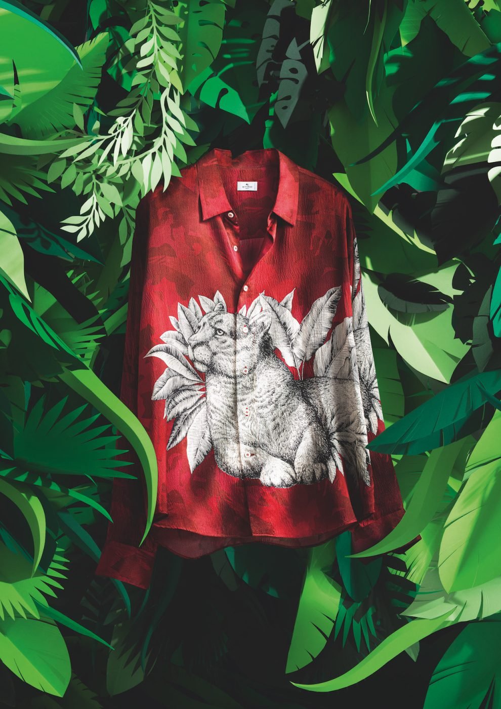 تتميز بالتناقضات والرسومات المتطورة المستوحاة من عالم الحيوانات ، وقد أعيد تصور رمز بيغاسوس الأيقوني في شكل تمويه مذهل ومزين بأوراق استوائية وتصميمات قطط برية ترمز إلى إبداع Etro الجامح والانتقائي.
