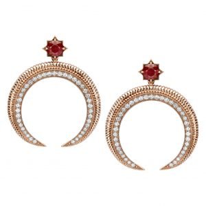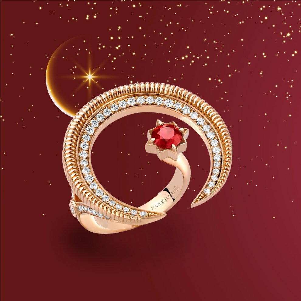 الطقم الجديد مصمّم من الذهب الوردي عيار 18 قيراط ومزيّن بتقنيّة التخديد التي تشتهر بها Fabergé. كل هلال مرصّع بحُبيبات الألماس البرّاقة، وتُحيط به نجمة جميلة مرصّعة بحجر ياقوت من شركة “جيم فيلدز”، وتحديداً من منجم مونتيبويز في الموزمبيق حيث يُستخرج الياقوت بطريقة مسؤولة ومستدامة مع الحرص على الحفاظ على البيئة والمجتمع المحلي.