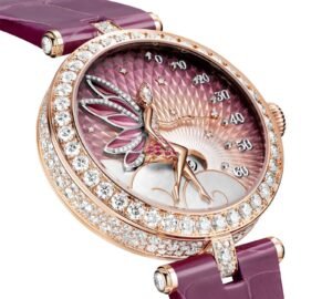 تجتمع مهارات صناعة الساعات وتصميم المجوهرات والمهارات النادرة لبث الحياة في هذا المشهد المفعم بالشاعرية. وتتميز ساعة لايدي فييري أور روز بآلية لف ذاتية وساعات قفز ودقائق رجعية. واستلزم تنفيذ هذه الحركة تخطيط وتصميم دقيقان للغاية لإمكانية إدراجها في هيكل ساعة لايدي من 33 ملم. ويرتفع هيكل الساعة بزجاج الصفير المقوس الذي يحمل الجنية الثلاثية الأبعاد من أجل تحقيق الحدّ الأقصى من دخول الضوء واستكمال إطار الساعة بانسيابية.